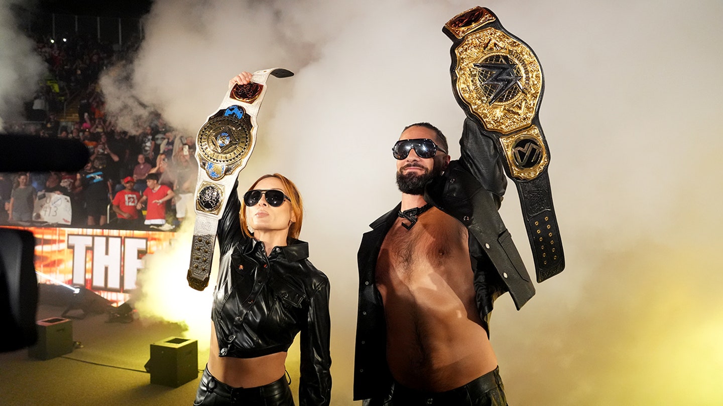 Becky Lynch and Seth Rollins head to the ring on “Monday Night RAW” at Mass Mutual Center on September 15, 2025 in Springfield, Massachusetts. (Rich Freeda/WWE via Getty Images))