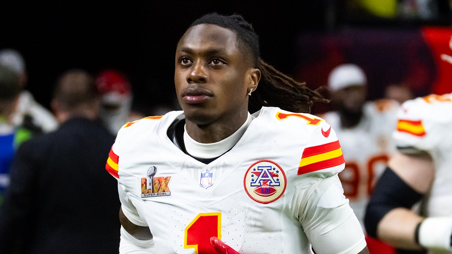 The wide chiefing of Kansas City chiefs, Xavier Worthy (1), against the Eagles of Philadelphia in the Super Bowl Lix with Caesars Superdome. (Images of Mark J. Rebilas-Imagn)