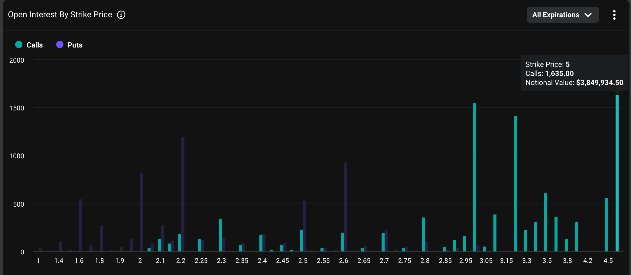 Despite this drop, the $ 5 purchase option remains the most favored bet on the drunkenness, offering a significant increase in buyers if the price exceeds this level. However, this does not necessarily indicate bullish positioning among traders.