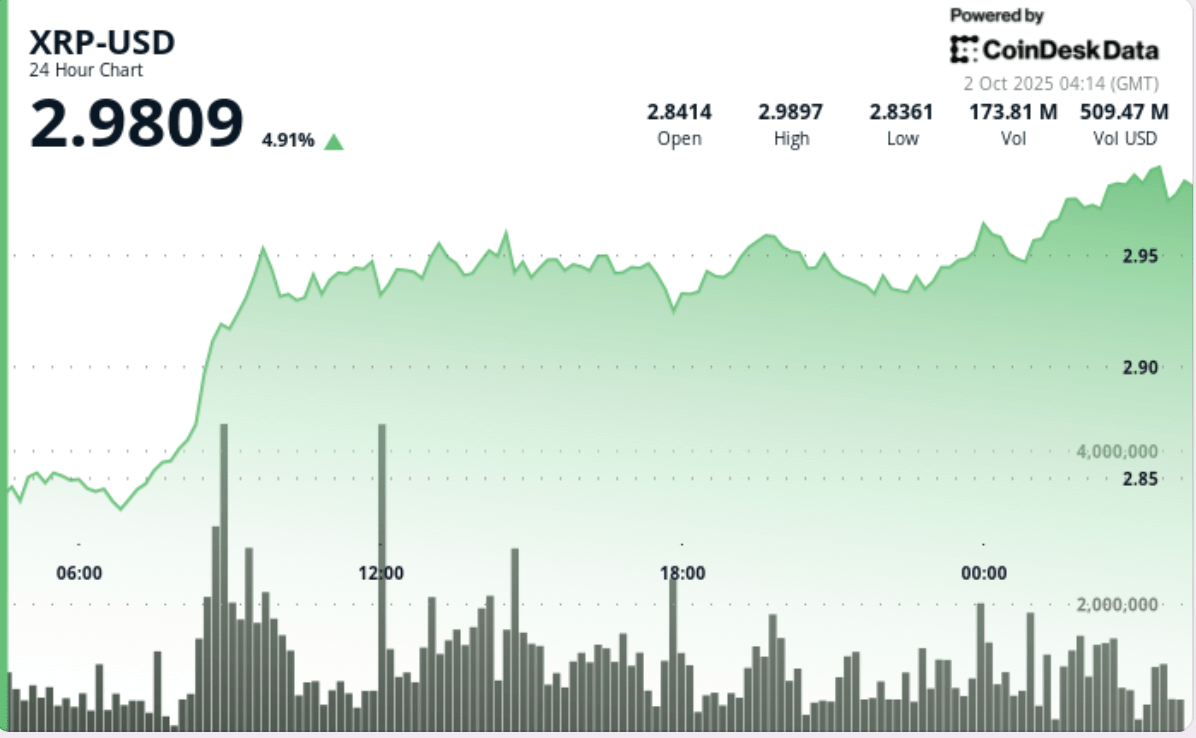 XRP climbed 5.2% compared to the 24 -hour window from October 1 from 03:00 to October 2, 02:00, from $ 2.84 to $ 2.97. This decision followed the launch by SBI of an XRP loan program for institutional payments, highlighting Japan’s thrust in large -scale adoption. The rally also comes as Ripple CTO David Schwartz goes to an emeritus role and with seven SPE deposits awaiting dry from October 18.
